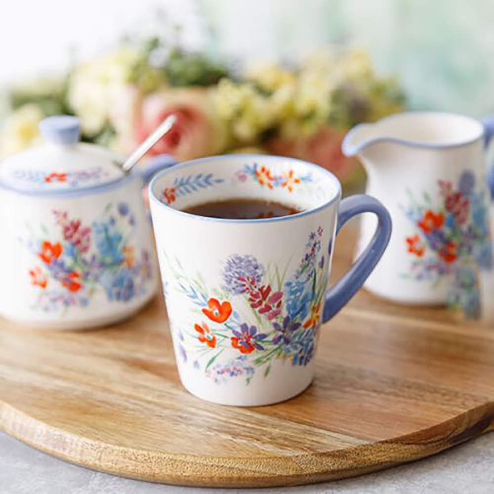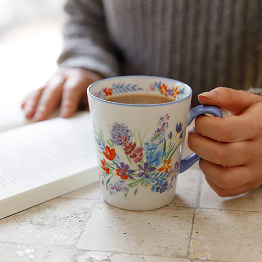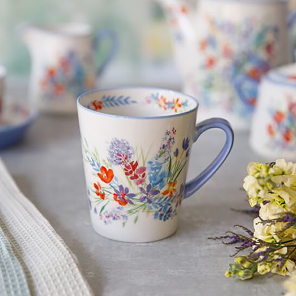 London Pottery Viscri Meadow 馬克杯提供了一種享受啤酒的可愛方式。這款杏仁象牙色馬克杯飾有花卉圖案,內緣有邊框裝飾。加上柔和的矢車菊藍色點綴,它擁有充滿活力的外觀。